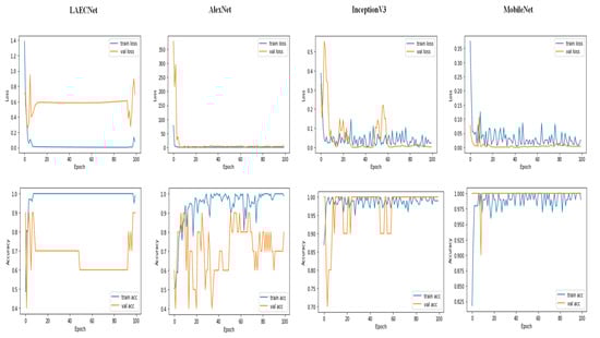 The LAECNet algorithm showed a noticeable gap between its two-loss curves, indicating an over-fitting problem (unrepresentative training data compared to validation data). In the same graphs, the Alexnet algorithm also exhibited some over-fitting due to unrepresentative validation data compared to the training data samples. However, Figure 8 (lower portion) indicates training convergence, with a decline in losses and an increase in accuracy.