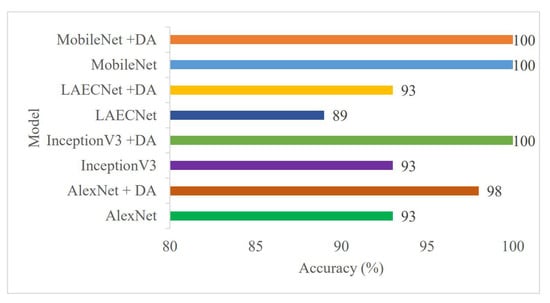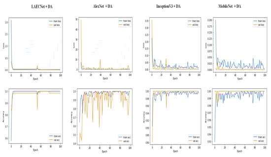 As shown in Figure 9 (upper portion), the algorithms still exhibited the problem of some over-fitting in the case of LAECNet + DA and AlexNet + DA. In addition, the InceptionV3 + DA and MobileNet + DA algorithms also showed some under-fitting. However, the algorithms with DA achieved better classification accuracy compared to the algorithms without DA.