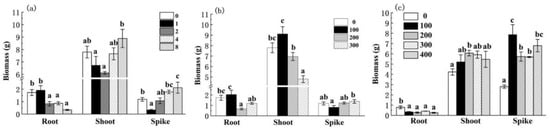 In the mature stage, the whole plant was washed with tap water until no soil was left in the root system. After washing the plant twice with deionized water, the roots, shoots, spikes, and grains were separated and packed into envelope bags. After drying these parts in an oven at 80 °C to constant weight, the different parts of each treatment were weighed to determine the dry weight.