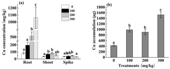 Figure 1b indicated that the shoot biomass of HH12 was the highest at 100 mg/kg Cu, which was not significantly different from that in the control group, but significantly higher than that at the other concentrations (p < 0.05). When the Cu concentration was 200 mg/kg, the shoot biomass of HH12 was the smallest, which decreased by 62.1% compared with that in the blank control group. As the Cu concentration increased, the shoot biomass of HH12 showed a downward trend, and the difference was significant (p < 0.05). The biomass of HH12 was the smallest at 300 mg/kg Cu, which decreased by 38.51% compared with that in the control group. As the Cu concentration increased, the biomass of the spike of HH12 showed no significant difference from that in the control group (p < 0.05).