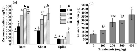 Figure 4a presents that the Zn content in the root of HH12 gradually increased with increasing Zn levels. When the Zn concentration was 200–400 mg/kg, the root Zn content was significantly higher than that in the control group (p < 0.05). However, no significant difference was observed among the different treatments (p > 0.05). At the Zn concentration of 300 mg/kg, the root Zn content was 512.11 mg/kg, which was 178.92% higher than that in the control group. The Zn content in the shoots and spikes of HH12 showed no significant difference (p > 0.05) at 100–300 mg/kg Zn, but an upward trend was noted. At 400 mg/kg Zn, the Zn contents in shoots and spikes were significantly higher than those in the control group (p < 0.05) (440.95 and 175.51 mg/kg, respectively) and increased by 124.45% and 139.11%, respectively. Figure 4b indicates that Zn accumulation in HH12 showed an upward trend with the increased Zn levels. At 300–400 mg/kg Zn, Zn accumulation was significantly higher than that in the control group (p < 0.05), and the total Zn accumulation was 3755.08 μg at 400 mg/kg, which was twice as much as that in the control group.