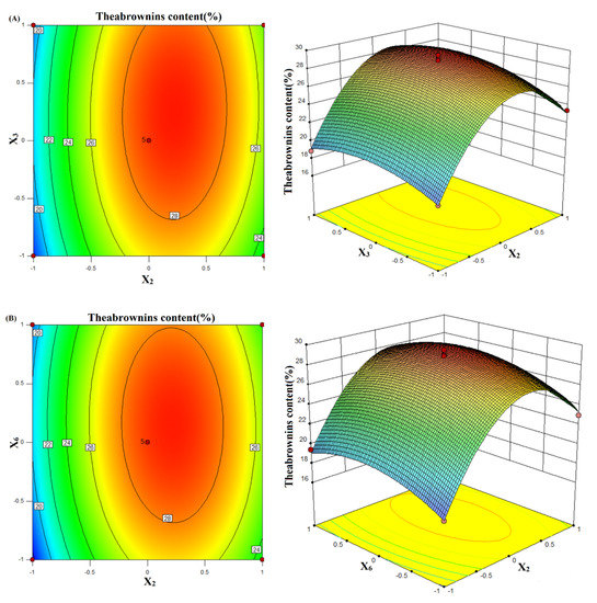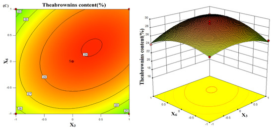 When the rotational speed was constant, the theabrownins content gradually increased with the feed–liquid ratio (X2) (Figure 1B). When the ratio was 1:30, the theabrownins content reached the maximum. When the feed–liquid ratio continued to increase, the theabrownins content gradually decreased. When the feed–liquid ratio remained unchanged, the theabrownins content gradually decreased upon increasing the rotation speed. When the rotation speed (X6) was 180 r/min, the theabrownins content reached the maximum value, and then upon further increasing the rotation speed, the theabrownins content gradually decreased again. The ovality in the contour line was smaller, which proved that the interaction of the two factors had no significant effect on the theabrownins content. It can be seen from Table 6 that the p-value of the AC interaction = 0.4954 > 0.05, and the effect was not significant.