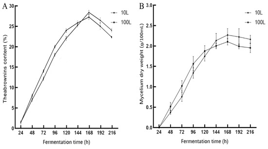 Variation curve of theabrownins content (A) and mycelial dry weight (B) in a 10 L and 100 L fermentor with fermentation time.