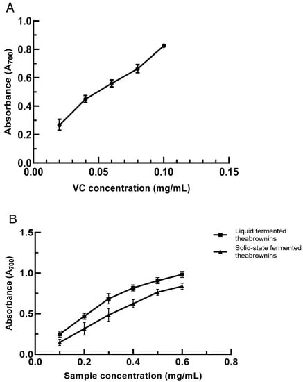Phosphate buffer solution (2.5 mL, pH 6.6, 0.2 M) and 2.5 mL of 1% (w/v) potassium ferricyanide solution were added to 1 mL of solid-state fermented theabrownins, liquid-fermented theabrownins, and VC, respectively, and the reaction was carried out in a water bath at 50 °C for 20 min [35]. Then, it was quickly cooled, 1 mL of 10% trichloroacetic acid was added, and the mixture was centrifuged at 3000× g r/min for 10 min. Distilled water (2.5 mL) and 0.5 mL of 0.1% ferric chloride were added to 2.5 mL of the supernatant, mixed well, and then allowed to stand for 10 min [36]. The absorbance was measured at 700 nm.