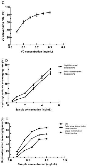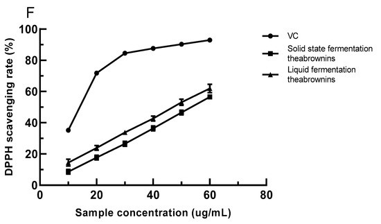 DPPH is commonly used to determine the free-radical scavenging ability of materials [41,45]. The scavenging ability of VC was stronger than that of solid- and liquid-fermented theabrownins when the sample concentration was in the range of 10–60 μg/mL (Figure 3F). The scavenging rate of DPPH free radicals was linearly correlated with the solid- and liquid-fermented theabrownins, and the scavenging rate of liquid-fermented theabrownins was higher than that obtained by solid-state fermentation. The IC50 values of VC and liquid- and solid-fermented theabrownins were significantly different (p < 0.05) and were 18.34, 33.11, and 34.18 µg/mL, respectively. The DPPH free-radical scavenging capacity of theabrownins may be linked to their active phenolic hydroxyl groups.