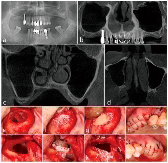 Implant treatment planned on a 72-year-old male smoker with no reported systemic conditions who previously used removable partial dentures. Panoramic imaging confirmed left and right maxillary sinus pneumatization with atrophied ridges. The height of the residual crestal bone on the panoramic radiography taken before surgery was approximately 1.0 mm in the right maxillary sinus and about 3 mm in the left maxillary sinus (Figure 3a,b). The CBCT taken before surgery confirmed no thickening of the Schneiderian membrane and thin lateral bone present over intended surgical site without the presence of the posterior superior alveolar artery. The maxillary ostium was open left and right (Figure 3c,d). In the lateral window approach performed in the right maxillary sinus, perforation of the Schneiderian membrane did not occur during the sinus floor elevation. The lateral bone lid was removed (Figure 3e). Osteon III (Genoss, Suwon, Korea) was filled in the elevated sinus, and the lateral window site was covered with a collagen membrane (Genoss, Suwon, Korea) (Figure 3f). The mucoperiosteal flap was closed (Figure 3g). In the lateral window approach performed on the left maxillary sinus, the membrane was perforated during sinus floor elevation. The lateral bone lid was pushed up while attached to the sinus membrane (Figure 3h). According to the modified proposed protocol of the open lateral window technique, the sinus floor was filled with Osteon III (Genoss, Suwon, Korea) and the upper part of the lateral window site was opened. Lateral window sites were not covered with a collagen membrane (Figure 3i). The mucoperiosteal flap was closed (Figure 3j). Post-operatively, intermittent nasal bleeding on the perforated sinus side with minor facial swelling and pain were noted for one week. Thereafter, no sinonasal complications were observed. In the coronal image of the CBCT taken immediately after surgery, no displacement of the bone graft particle was observed in the left and right sinus bone grafts (Figure 3k). In the coronal image of the CBCT taken 6 months after surgery, there was little change in the volume of the left and right sinus bone grafts, and minimal membrane thickening was observed only in the left maxillary sinus bone graft. All exposed bone graft substitutes were covered with soft tissue (Figure 3l).
