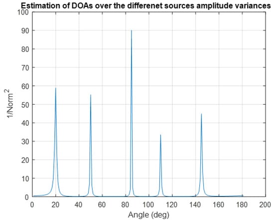 It should be noted that is not a real spectrum (it is a measure of the distance between two subspaces), it gives us peaks corresponding to the exact directions of arrival of the waves but does not tell us about the power of the sources.