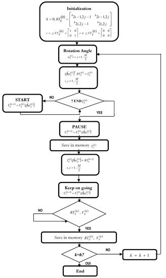 This section describes the basic principle of the Cyclic Jacobi method [25,26]. It can be implemented with a simple iterative rotation plan process. This method makes it possible to solve problems of symmetric eigenvalues by applying a sequence of orthonormal rotations on the left and right sides of the matrix R [27].