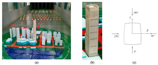The HFFB model was mounted on a six-component force balance made by ME-β system company, Germany, with a measurement accuracy of 0.3% F.S. All models were made of lightweight wood, and the first sway frequency of the model-balance system is larger than 40 Hz, which meets the model requirement of the HFFB test. The base overturning moment and dynamic response can be attained after considering the dynamic properties of the building, such as mass and damping [24,25]. The wind tunnel tests were conducted at wind directions of 0–345° with an interval of 15°. The testing velocity atop the building was 10.06 m/s, and the HFFB data were recorded at a sampling frequency of 500 Hz with a sampling length of 60 s. The design wind velocity of the building was 30.98 m/s at the height of 10 m, and the wind forces in the following sections are presented in full scale based on the similarity criterion.