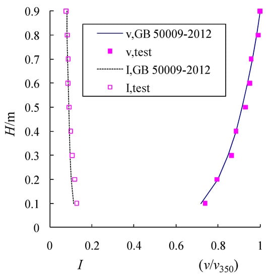 The tests were conducted in the ZD-1 boundary layer wind tunnel at Zhejiang University, China. According to the Chinese code entitled “Load code for the design of building structures” [23], the terrain condition around the building is Terrain Category B, which corresponds to the open type terrain. In order to simulate the boundary layer wind field corresponding to Terrain Category B, spires arrays combined with floor roughness elements were employed in the wind tunnel (see Figure 1a). The wind velocities along the height at the center of the turntable were recorded using a three-dimensional Cobra Probe (Turbulent Flow Instrumentation). The mean wind speed v and turbulence intensity I profiles of Terrain Category B were tested in the wind tunnel and shown in Figure 2, in which the wind speed normalizes the mean wind speed at 350 m in full scale. It can be seen that the simulated profiles agree well with that regulated in GB 50009-2012 [23].