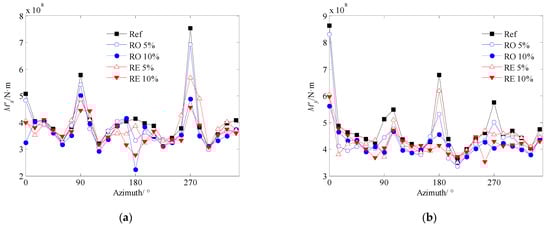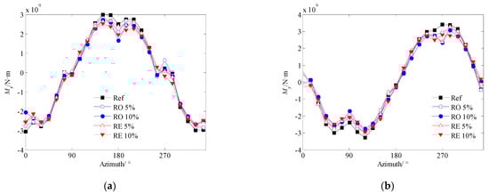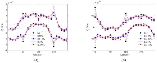 The standard deviations of the base overturning moments Mx and My in the x-direction and y-direction of the five models are shown in Figure 4. It is found that the maximum standard deviation of Mx occurs at azimuth 270°. The pronounced standard deviation at the azimuth is mainly led by the cross-wind fluctuations originating from wake excitation. Among the five models, the RO10% model shows the smallest value at the azimuth. The standard deviations of Mx at azimuth 0° and 180° are much lower than that at azimuth 270°, which corresponds to the along wind fluctuating aerodynamic forces typically led by the approaching turbulence.