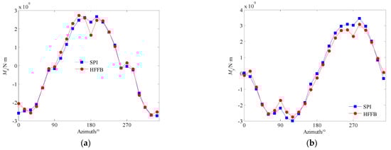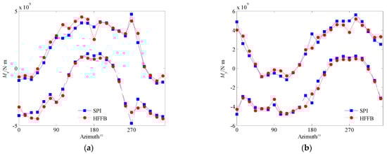 Comparison of extreme base overturning moments of HFFB and SPI: (a) Mx. (b) My.