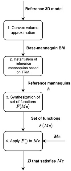 - Based on the known data of (geometry and measurements), a set of functions is created. This set of functions synthesizes the geometry of a measurement-driven mannequin that in return satisfies the given measurements in . See Section 3.6.