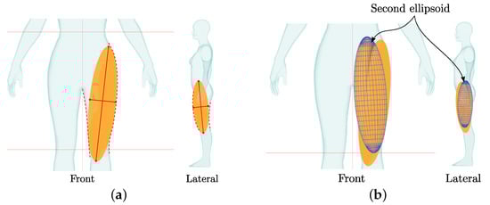 - A reference 3D model is manually approximated/traced with ellipsoids to produce a Base Mannequin (). Furthermore, an ellipsoid-to-cushion post-process is presented to improve the convex volume approximation after it has been parameterized. See Section 3.2.