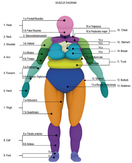 - Scheepers, F.; Parent, R.E.; Carlson, W.E.; May, S.F. Anatomy-based modeling of the human musculature. In Proceedings of the 24th Annual Conference on Computer Graphics and Interactive Techniques, Los Angeles, CA, USA, 3–8 August 1997; pp. 163–172. [Google Scholar]