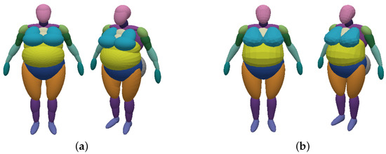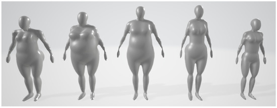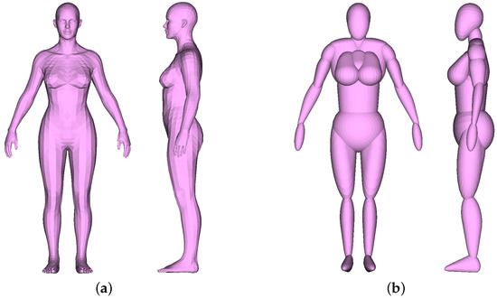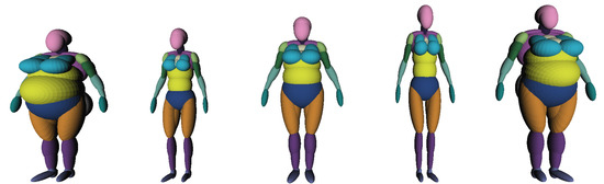 - References [17,18] preprocess 250 (125 females and 125 males) scanned models from the SizeKorea database. The models are categorized, and the correlations between body shape variation and body sizes are extracted through statistical analysis (PCA). With such correlations, new models are obtained through shape parameter optimization techniques and radial-basis function (RBF) deformation of a template surface.