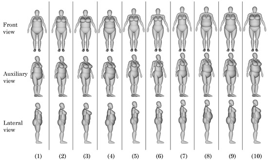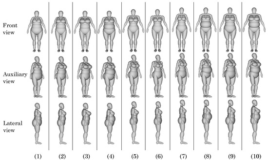 - Goncharenko, I.; Takashiba, K.; Mochimaru, M.; Kouchi, M.; Usui, S.; Odahara, M. Low-parametric control of human body shape modelling via the web using 3D scan data. Int. J. Hum. Factors Model. Simul. 1 2012, 3, 187–203. [Google Scholar] [CrossRef]
