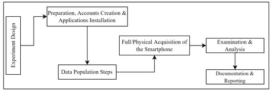 The National Institute of Standards and Technology (NIST) is the premier organization for establishing acceptable measurements, standards, guidelines, and procedures for various products, systems, and technologies [19]. NIST has published guidelines on conducting mobile forensic investigations and identified the four broad steps of mobile forensics, such as (1) preservation, (2) acquisition, (3) examination and analysis, and (4) reporting. The authors have followed these steps in conducting this study, as detailed below.