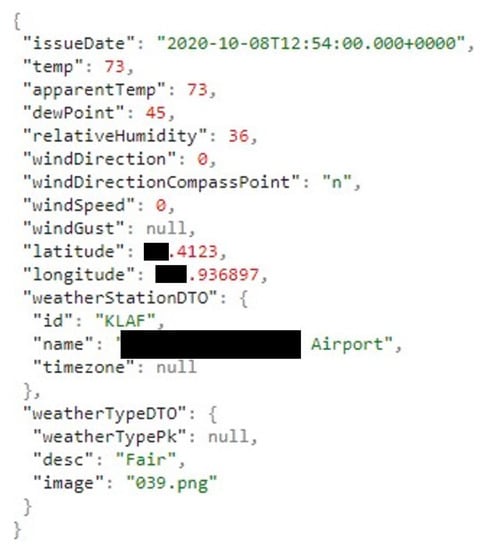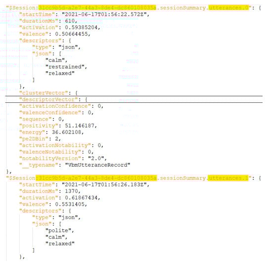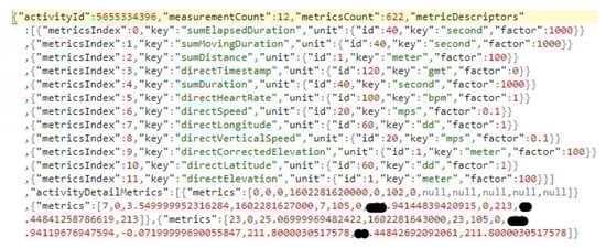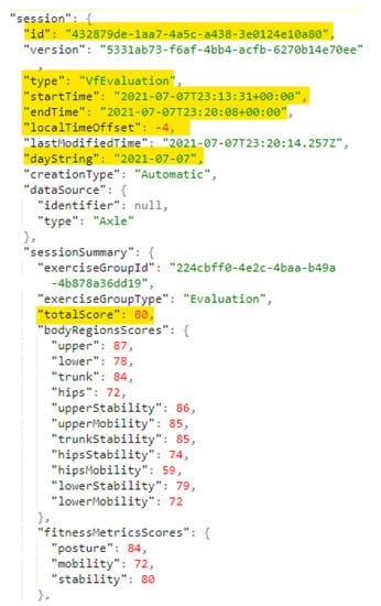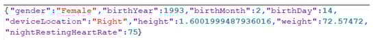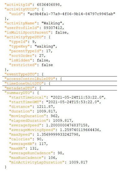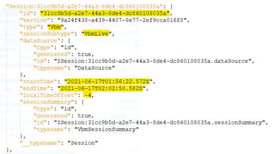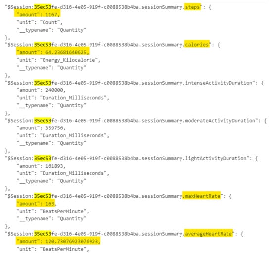 A session is generated whenever the user does a workout, which may be recorded manually by the user or automatically by the device and app, or uses Tone Analysis. An example of an automatically recorded workout session is shown in Figure 6, where the session ID is 35ec53fe-d316-4e05-919f-c0088538b4ba. Along with the workout session start and end times, the authors are also able to recover session-related details such as the number of steps the user took, the number of calories the user burned in kilocalories, the length of time the user spent doing intense, moderate, and light activity in milliseconds, and the user’s maximum and average heart rates. The details associated with the session 35ec53fe-d316-4e05-919f-c0088538b4ba are shown in Figure 7.
