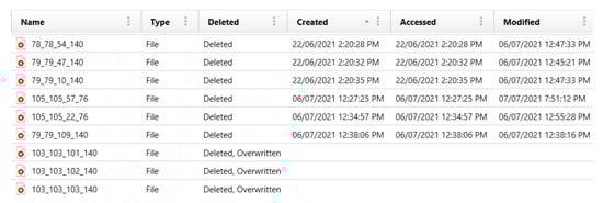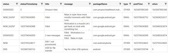 Once the authors had the forensic image, they examined and analyzed this image using the Magnet AXIOM Examine tool [27]. This tool allows us to view all the recovered artifacts in various formats, particularly through an “Artifacts View” or directly via the “File system View”. The examination phase simply involves us filtering any apps and date ranges that are irrelevant to our investigation, while the analysis phase involves us combing through all recovered artifacts from the three chosen apps under investigation to determine what data are recoverable, along with their locations in the Android filesystem. The authors’ goal in this study is not to determine the validity of the data being recorded by the wearable devices but rather to present an effective methodology and process for recovering and analyzing the populated data. Furthermore, for verification and validation purposes, we used Autopsy [28], which is a well-known open source digital forensics tool that is used by many agencies and practitioners around the world.