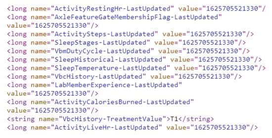 Table catalystLocalStorage also records the bulk of activity-related data. The reduxPersist:appsync and reduxPersist:appsync-metadata rows both hold varying combinations of hourly, daily, weekly, and monthly values for health metrics, such as maximum, average, and resting heart rates, sleep summaries, and skin temperatures, and activity related data, such as workouts, steps, and tone analysis results. All artifacts discussed in this section were recovered from either of these two rows, unless otherwise specified.