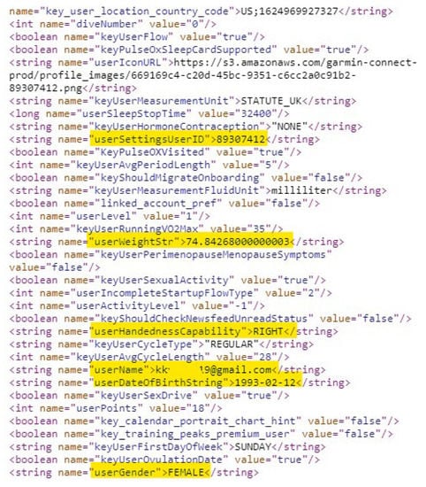 MacDermott et al. [13] conducted a forensic analysis of three fitness wearable devices: a Garmin Forerunner 110, a Fitbit Charge HR, and a generic low-cost HETP fitness tracker. The authors identified forensically relevant artifacts stored by these devices by manually examining their associated Windows 10 app (Fitbit) or directly connecting the wearable to a Windows 10 computer (Garmin). The HETP band only interacts with a mobile app. However, the authors were unable to view any data that may have been stored within the app. The authors found that the Garmin device and the Fitbit Windows 10 app record a wealth of forensically relevant data. Notably, they were able to recover details about the test runs they did to populate the devices with data, including GPS locations (Fitbit), deleted records (Garmin), group chat/post interactions (Fitbit), and other user and device information (both). However, these authors did not investigate what forensically relevant data can be recovered from the mobile apps of these devices, a limitation in our opinion. As such, our investigation will extend their work by conducting a forensic analysis of the Garmin Connect app on Android 10, while Yoon and Karabiyik’s work [12] filled the gap by investigating the Fitbit app on a mobile device.