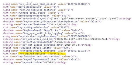 Kang et al. [15] conducted a forensic analysis of the Mi Fit and Fitbit apps on an Android 7 device after using the Mi Band 2 and Fitbit Alta HR fitness trackers, respectively. The authors showed that it was possible to recover artifacts related to the user’s entered profile information (e.g., birth date, name, weight, and height), the device used (device’s MAC address and ID), daily sleep and step records, activity data (step counts and distance timestamps), and activity tracking data (start times and GPS coordinates) from the Mi Fit app. Regarding the Fitbit app, the authors noted that they could recover the device information, step counts, sleep information, activity information, and GPS data associated with a tracked exercise. The authors noted that the sleep and activity data could be modified by the account users for both apps, while the activity data cannot be modified, but only deleted. These two observations have profound implications should these devices/apps appear during a forensic investigation. One limitation of this work was the lack of information on how the fitness trackers were populated as this process was unclear in the paper.