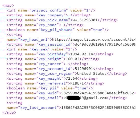 User PII were recorded in .xml files within the \shared_prefs folder. The account_info.xml and SettingSP.xml files both contained the user’s height in centimeters and weight in kilograms. The SettingSP.xml file records the user’s step_length information while the account_info.xml file holds the user’s email, birthday, age, and a URL link to the user’s profile picture (see Figure 24 which has been redacted to preserve the privacy and security of our test accounts). The user phone number in Base64 and the IP address were recovered from the c_64ei and customer_ip rows, respectively, in the cookies table within the \app_webview\Default\Cookies.db database. We were then able to recover an approximate GPS location tied to the device’s IP address from the \cache\WebView\Default\HTTP Cache\a3780a74150574c9_0 file.