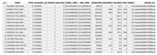 In terms of health-related data, TicWatch stores these data in multiple database files. The first of these databases is the \databases\fitness.db database. TheTable RECORD in this database stores health and activity information, such as heart rate, step count, calories, start time, end time, and distance (see Figure 25). Each entry has a HASH related to it, as well as a TYPE and a DEVICE_ID. It is difficult to determine the purpose of the hash value and which activities the types relate to. However, given enough time and context from other stored tables, one could potentially determine what the related health data represent. It is possible that TYPE identifies the exact activity that was recorded by the watch. The DEVICE_ID in this table corresponds to the smartwatch’s device ID. The fitness.db-wal file was also examined to determine whether any information was discoverable outside of the database file, but the information contained data that were already available in the associated database file.