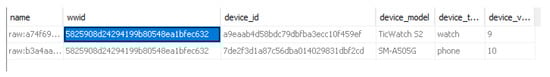 More relevant health data was recovered from the health_common.db database which contains the data_point table (see Figure 26). The data_point table includes the device_id, which refers to either the Mobvoi Ticwatch or Samsung phone as shown by the data_source table (see Figure 27), a wwid, which may be an unique identifier for the user, a type, which identifies the type of activity data being recorded, and time_to and time_from timestamps, which denote the activity’s start and end times. Moreover, the data_point table appears to be a superset of the RECORD table in the fitness.db database, which means given these two tables, one could potentially extrapolate more meaningful information about the health activities.