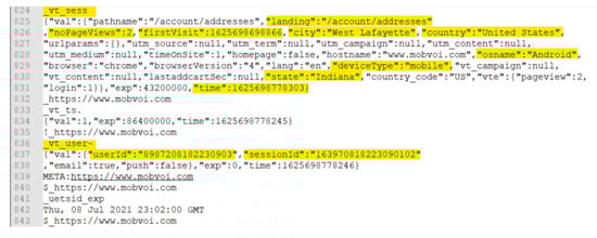 The \app_webview\Default\Local Storage\leveldb\000003.log log file seems to record details on when the user visited various app activity screens and includes data such as location (city, state, and country), the name of the activity (screen) the user visited, timestamps, details about the device used, and a user ID (see Figure 28). The \shared_prefs folder contains multiple files relevant to how the app was used. For instance, the \com.google.android.gms.measurements.prefs.xml file contained information on the general use of the app, including the last time the data was uploaded to the server, the first time the app was opened, and the last time the app was paused. The wear_info.xml file contains information about the TicWatch device, including the device’s Bluetooth address (btAddress) and name (btName), Serial Number (sn), device capabilities (wearCapability), and an assigned device ID (wearDeviceID) for the smartwatch (see Figure 29). The DeviceInfo.xml and com_mobvoi_devices_id.xml files both record device IDs, a528572b-e63e-4d02-9cdf-cb5859e9b64a and 7de2f3d1a87c56dba014029831dbf2cd, respectively, where the latter is the smartphone’s device ID.