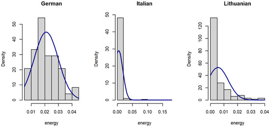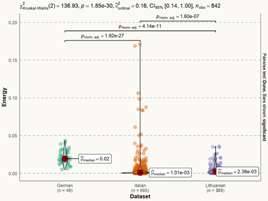 Statistical distribution of voice signal energy in datasets. The difference between the German and Italian datasets is statistically significant (p < 0.001). The difference between the German and Lithuanian datasets is statistically significant (p < 0.001). The difference between the Italian and Lithuanian datasets is statistically significant (p < 0.001).