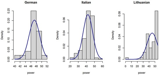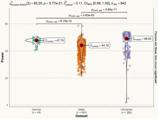 The signal power of the Lithuanian dataset (median = 49.00) is larger than signal power of both the German dataset (median = 47.70) and the Italian dataset (median = 44.10 dB). The difference is statistically significant (Figure 5).