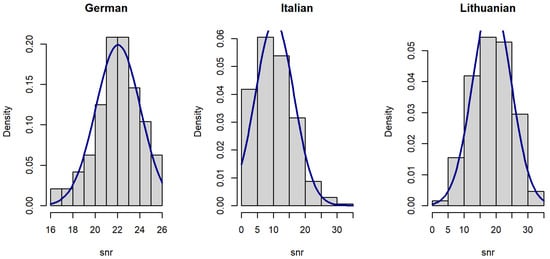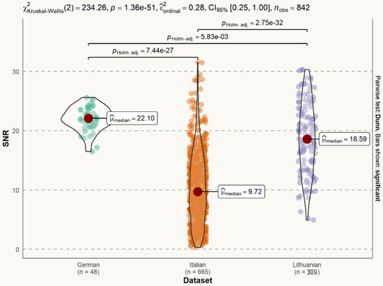 The SNR of the Lithuanian dataset (median = 18.59 dB) is lower than the SNR of the German dataset (median = 22.10 dB), but larger than the SNR of the Italian dataset (median = 9.72 dB). The difference is statistically significant (Figure 6).