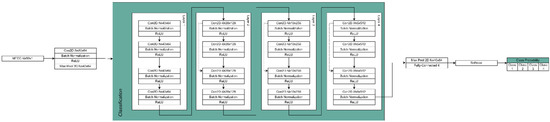 The deep neural network consists of four feature extraction layers, and each of the layers subsists of four feature extraction nodes. The node in this context consists of three operations: convolution, normalization, and non-linearity function. The convolution operation takes an input cochleagram image that can be represented as a 2D matrix, and the convolutional kernel selects the latent features. The output matrix is then fed into a batch normalization operation, which has been shown to reduce training times, improve recall rates, and reduce occurrences of gradient explosion or vanishing [63,64]. The batch normalized result is then applied with a non-linearity function. In our case, we used a Rectified Linear Unit (ReLU), as it was experimentally determined to be the best non-linearity function when dealing with cochleagram images, in addition to its mathematical simplicity [65,66]. Each layer’s first convolutional operation kernel also performs a stride operation of size 2. This reduces the input dimensionality by skipping every other value in the input. Dimensionality reduction is not only necessary to perform the operations in real-time on modern hardware, but also improves the recall rate by removing potential noise from the input by selecting only the most prominent features. In each layer except the first, the first and third nodes are connected residually (skip connections). Skip connections have been shown to improve gradient propagation due to the spatial structuring of the gradients [63]. Finally, each layer’s second and fourth feature extraction nodes are summed up and sent to the following layer.