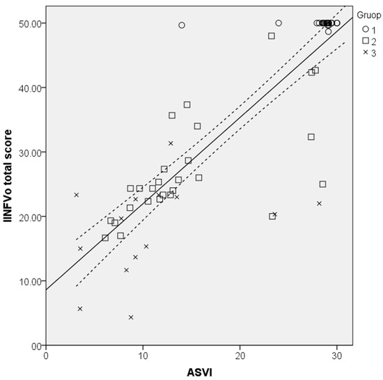 Scatterplot illustrating the correlation between the Impression, Intelligibility, Noise, Fluency, and Voicing perceptual rating scale (IINFVo) and the acoustic substitution voicing index (ASVI) with a 95% confidence interval.