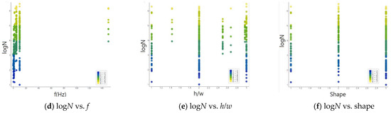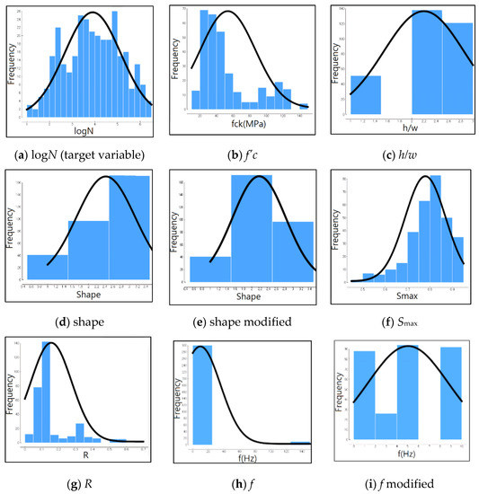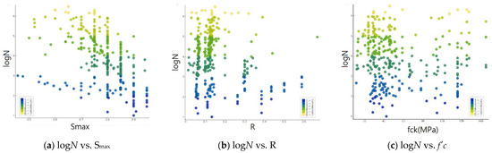 This study covers low-strength hydraulic concrete (10~30 MPa), ordinary concrete (30~60 MPa), and high-strength concrete (60~120 MPa). The h/w of the test specimens ranged from 1.0 to 3.0, and the specimen’s shape includes the cube, prism, and cylinder. The loading conditions were also greatly diverse, with the Smax ranging from 0.457 to 0.95, the R covering 0 to about 0.67, and a loading frequency ranging from 0.0625 to 150 Hz. The dataset used in this study is summarized below.