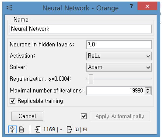 Figure 8. The rectified linear unit function is selected as the activation function for the hidden layer. As a solver for weight optimization, a stochastic gradient-based optimizer called Adam is used. As a regularization parameter, commonly called alpha, 0.0004 is used. Replicable training is allowed.