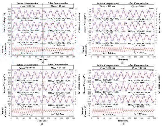 Experimental results of three-phase PCC voltage, source current and neutral current before and after the LC-HAPF compensation with (a) LQRC under 50V DC-link voltage; (b) LQRC under 40V DC-link voltage; (c) LQRIC under 50 V DC-link voltage and (d) LQRIC under 40 V DC-link voltage. (For each graph, the blue lines are the waveforms of source voltage, the red lines in the 1st, 2nd and 3rd tunes are the waveforms of source current, and the red lines in last tune are the waveforms of neutral current.)