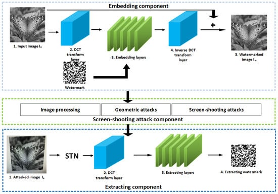 8], the process of watermark embedding depends on a manual design named the superposition-based embedding scheme, and watermark extraction is designed using a deep neural network (DNN). The extraction algorithm is composed of enhancing, attention-guided [