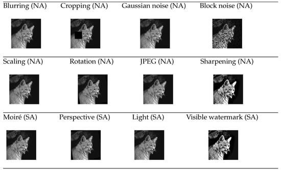 Special attacks (SA). The image suffers from space conversion processes and lead to a combination of strong attacks, such as perspective deformation, moiré (U-Net), lens distortion, visible watermark (parameters: 1, 3, 9, 12, 15 and 16), light (brightness and contrast), color changing (hue = 0.1, luminance = 0.5) and display distortion (scaling), when an image displayed on the screen is shot.