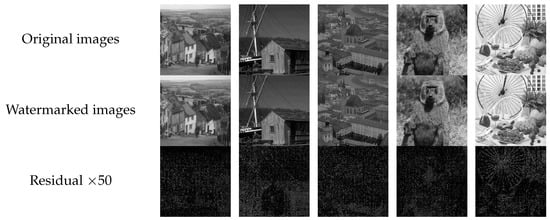 Figure 14 illustrates the original and watermarked images as well as the difference image between the original image and the watermarked images with an enhancement of 50×.