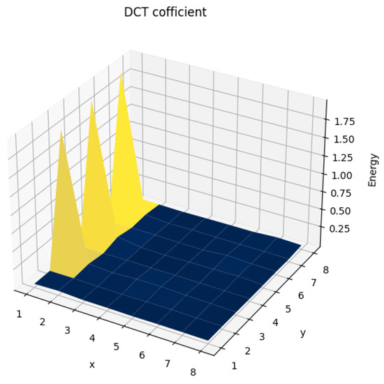Figure 16 presents the 3D plot of frequency energy. The frequency energy is calculated using the absolute values of DCT coefficients of an 8 × 8 block of the diffusion watermark. DCT coefficients are arranged on the horizontal axis in zigzag order of the DCT block. For example, we start from the DC coefficient DCT(0, 0) toward the maximum frequency DCT(7, 7). The framework learns to avoid embedding in the DC coefficient due to destructive effects on image quality and PSNR.