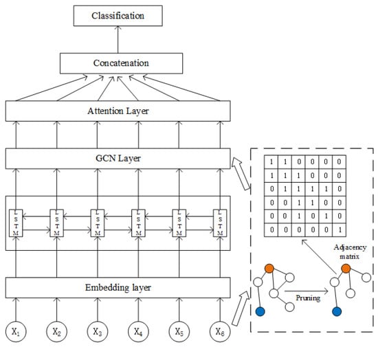 Firstly, the sentences are preprocessed, and the feature vectors obtained by encoding the word segmentation through the BiLSTM layer are used as nodes in the graph. The relations between different nodes in the results of the dependency analysis are then used as edges that constitute the graph structure of the graph convolutional neural network. To reduce the effect of noise in the sentences, the model uses a pruning strategy on the dependency tree and transforms the pruned dependency graph into the adjacency matrix A.