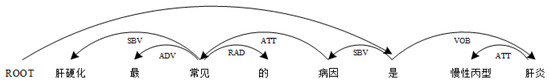 Dependency tree. The Chinese sentence in the figure means “The most common cause of liver cirrhosis is chronic hepatitis C”. “肝硬化” represents “liver cirrhosis”, “最” represents “the most”, “常见” represents “common”, “的” represents “of”, “病因” represents “cause”, “是” represents “is”, “慢性丙型” represents “chronic C”, “肝炎” represents “hepatitis”. Root, root node; SBV, subject–predicate relation; ADV, dative–medial relation; ATT, definitive–medial relation; RAD, right-additive relation; VOB, verb–object relation.