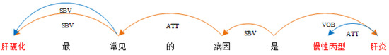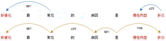 Diagram of the novel pruning strategy for fusion. SBV, subject–predicate relation; ATT, definitive–medial relation; VOB, verb–object relation. The Chinese sentence in the figure means “The most common cause of liver cirrhosis is chronic hepatitis C”. “肝硬化” represents “liver cirrhosis”, “最” represents “the most”, “常见” represents “common”, “的” represents “of”, “病因” represents “cause”, “是” represents “is”, “慢性丙型” represents “chronic C”, “肝炎” represents “hepatitis”.