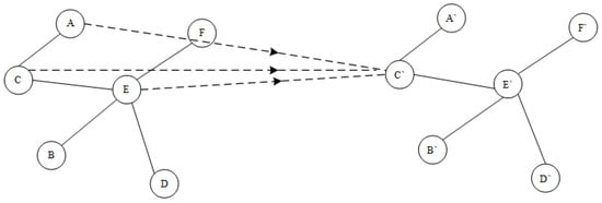 Although the lowest common ancestor subtree and shortest dependency path methods can remove some useless nodes, there is a possibility that some dependency information will be lost during pruning, and that even critical information will be lost. As shown in Figure 4, we propose a combination of a local subtree and the shortest path tree to construct the input graph. The local subtree contains all the dependencies directly connected to the head entity and the tail entity. The shortest path tree contains all the dependencies on the shortest path between two entities. In a complete dependency tree, the path from the root node through the least number of nodes to the head and tail entity nodes is the shortest path. The shortest dependency path can effectively represent the structure of semantic relationships between entities, and the path contains the lexical information on the path between the root node and the head and tail entity nodes. In the pruning operation, we retain all node relations contained in the local subtree and all node relations contained in the shortest path tree. We consider the words removed from the sentence by the two pruning operations as noise, and the words retained by the two pruning operations as actual retention. The dependency tree is pruned into two subtrees by two pruning operations, and then, the final dependency tree is formed based on the node dependencies retained by the two subtrees. When transforming the pruned dependency tree into an adjacency matrix, the corresponding adjacency matrix value is set to 1 for the retained nodes and 0 for the deleted nodes. As shown in Figure 5, our final dependency relation graph is composed of two different dependency relation graphs, which allows the dependency relation graph to have reduced noise while retaining valid information.