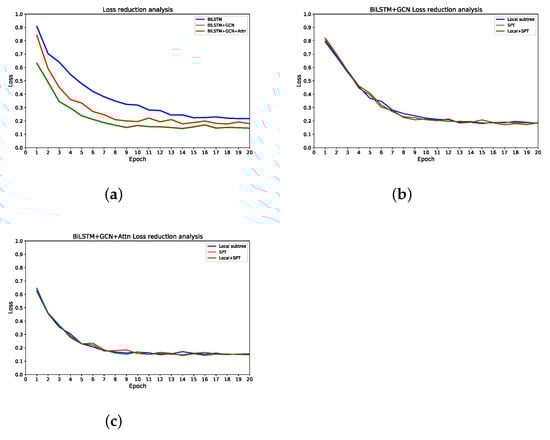 As shown in Figure 7, the experiment compares the loss reduction states of the three models. Trained with the same parameter settings, the lowest loss in the experiment is 0.2173 for the BiLSTM model, 0.1773 for the BiLSTM+GCN model, and 0.1430 for the BiLSTM+Attn+GCN model. compared with the BiLSTM model and the BiLSTM+GCN model, our proposed BiLSTM+Attn+GCN model converges faster and has the smallest loss value, indicating that the model predicts results more accurately and classifies better. Comparing (b) and (c) in Figure 7 shows the change in loss decline of the two models after incorporating the three pruning operations. The experimental results show that the loss of the model converges faster after adding the pruning operation. It shows that by adding pruning, the redundant weights in the model are removed, and computational efficiency is improved at the same time. The experiments compare the BiLSTM+GCN (add pruning) model and BiLSTM+Attn+GCN (add pruning) model. The latter has the fastest convergence speed and the lowest loss value, which indicates that the model has the best classification.
