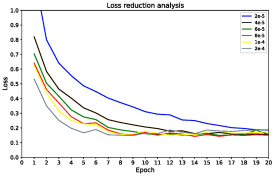 The experiments also compare the effects of different learning rates on model performance. The learning rate comparison experiments are validated on a BAGCN model that includes a novel pruning operation. The learning rate directly affects the convergence state of the model, and choosing a suitable initial learning rate can lead to better model training. If the initial learning rate is too large, the model will not converge. If the initial learning rate is too small, the model will converge too slowly. As shown in Figure 8, the degree of convergence of model loss is different at different learning rates. When the learning rate is small, the model converges slowly. When the learning rate is larger, the loss of the model first decreases and then increases. Too large a learning rate leads to overfitting the data in the training set, which makes the model less generalizable. When the learning rate is 8 × 10, the loss of the model is minimized, and the loss tends to smooth out as the number of training iterations increases, indicating that an appropriate learning rate can lead to better convergence of the model loss.