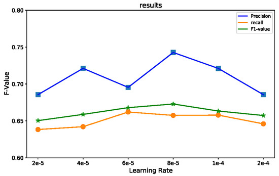 As shown in Figure 9, this paper also verifies the comparison of model results at different learning rates. The experiments show that the F1 value of the model gradually increases to the maximum and then decreases as the learning rate increases. In the experimental results, Marco-P is 0.721, and Marco-R is 0.642 for a learning rate of 4 . Marco-P is 0.695, and Marco-R is 0.662 for a learning rate of 6 . The Marco-P decreased by 0.026 and the Marco-R increased by 0.020 at a learning rate of 6 compared to the results for 4 . For the changes in the experimental results occurring at a learning rate of 6 , we examine the sample labeling results of the model predictions. In some relation categories with a large number of samples, the model predicts a large number of negative samples as positive samples (i.e., FP becomes larger; the denominator becomes larger in the Marco-P formula), which leads to a decrease in accuracy in these categories. In several relation categories with smaller sample sizes, the model predicts fewer positive samples as negative (i.e., FN becomes smaller; the denominator becomes smaller in the Marco-R formula), which leads to higher recall in these categories. In the categories with smaller sample sizes, the labeling of each sample has a significant impact on the identification results for that category. In addition, Macro-P and Marco-R are used in this paper, and the precision and recall of all categories affect the final results equally. At a learning rate of 6 , the reason for the change in Marco-P and Marco-R is the large change in precision and recall for some relation categories. We used Marco-F1 to evaluate the model performance more comprehensively, thus balancing the effects of precision and recall. The Marco-F1 of the model reaches the maximum value when the learning rate is 8 , which indicates that the model works best at the current initial learning rate.